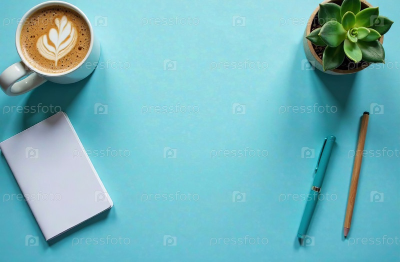 Плоский офисный рабочий стол с синим фоном, минималистичные канцелярские принадлежности. Генеративный искусственный интеллект