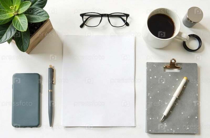 Flat Lay Office Desktop белый фон, минималистичные канцелярские принадлежности. генеративный искусственный интеллект