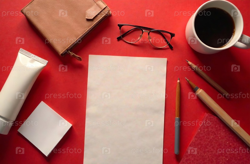 Flat Lay Office Desktop красный фон, минималистичные канцелярские принадлежности Генеративный искусственный интеллект