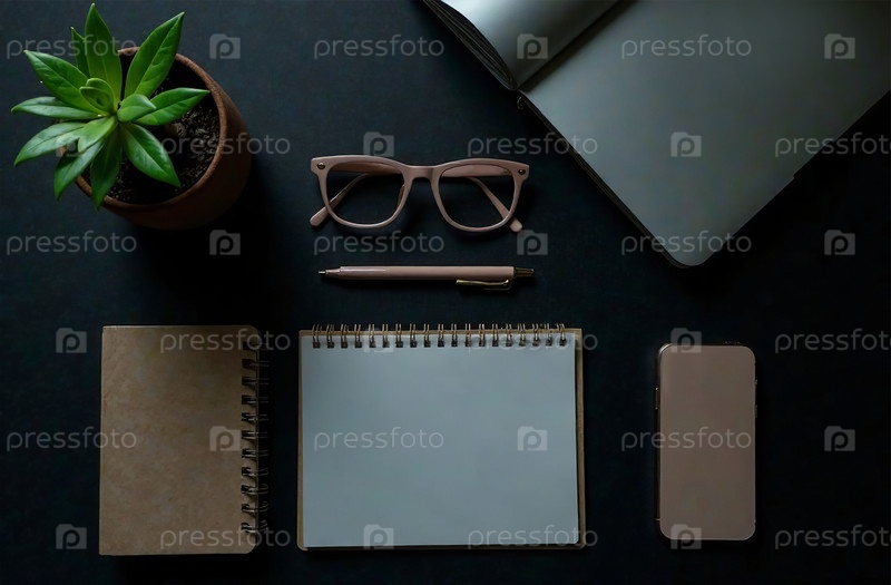 Flat Lay Office Desktop черный фон, минималистичные канцелярские принадлежности. генеративный искусственный интеллект
