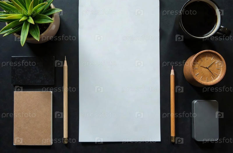 Flat Lay Office Desktop черный фон, минималистичные канцелярские принадлежности. генеративный искусственный интеллект