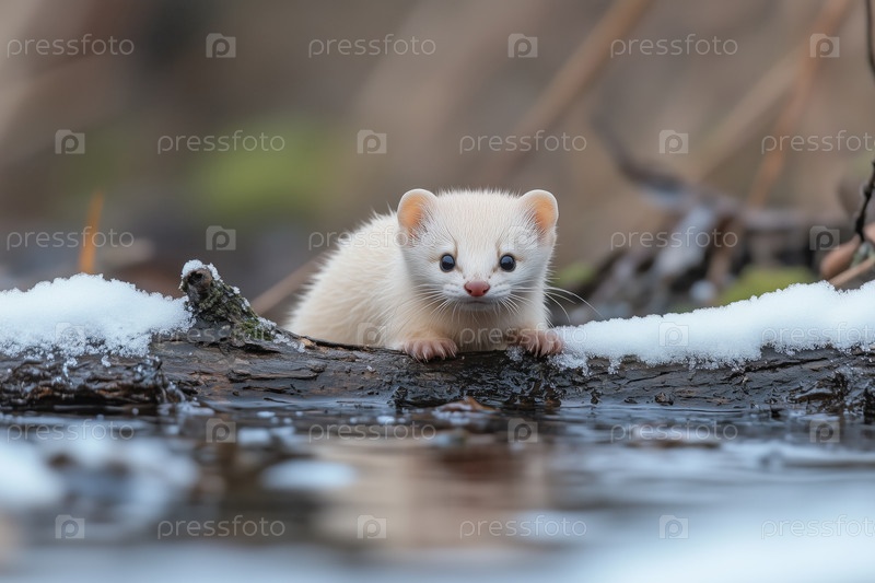Белая норка на бревне у воды зимой