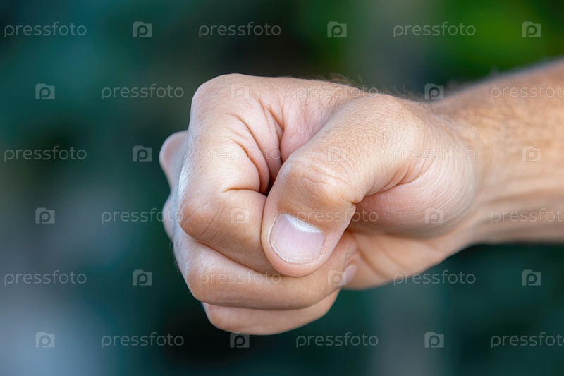 Рука мужчины со сжатым кулаком на размытом зеленом фоне, крупный план