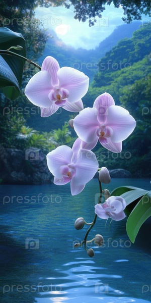 Розовый цветок орхидеи с отражением в воде и на фоне гор