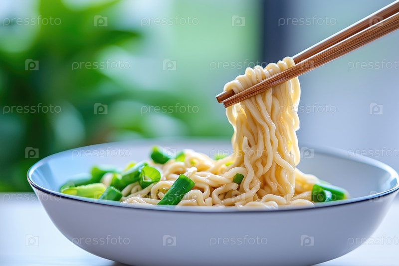 Китайская лапша с зеленым луком и палочками в белой миске на столе