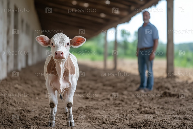 Портрет белого теленка на ферме с фермером на заднем плане