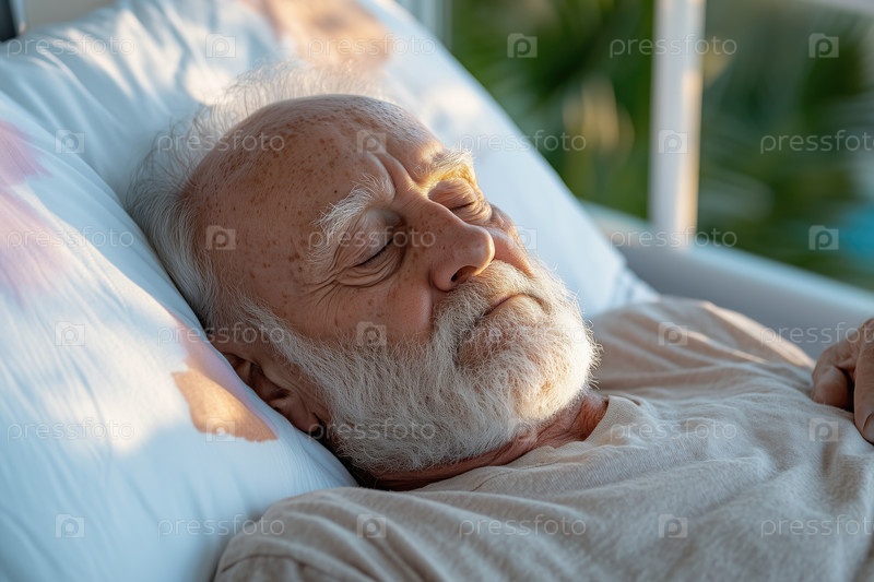 Вид сбоку на пожилого мужчину, спящего на кровати в больничной палате