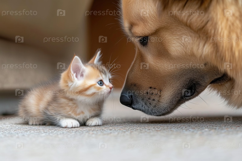 Большая собака и маленький котенок знакомятся друг с другом на полу дома