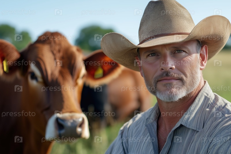 Фермер в поле с коровами. Портрет мужчины в ковбойской шляпе