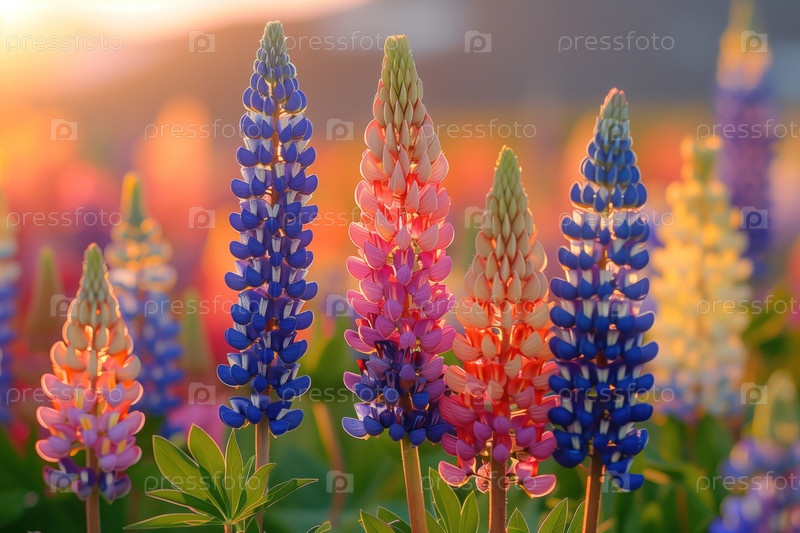 Красочные цветы люпина цветут в поле на закате. Красивый цветочный фон