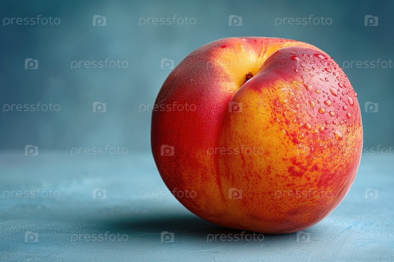 Спелый нектарин с каплями воды на синем фоне