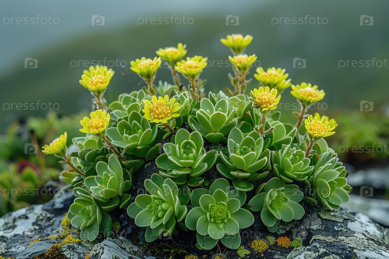 Цветущее суккулентное растение на скале крупным планом. Естественный фон