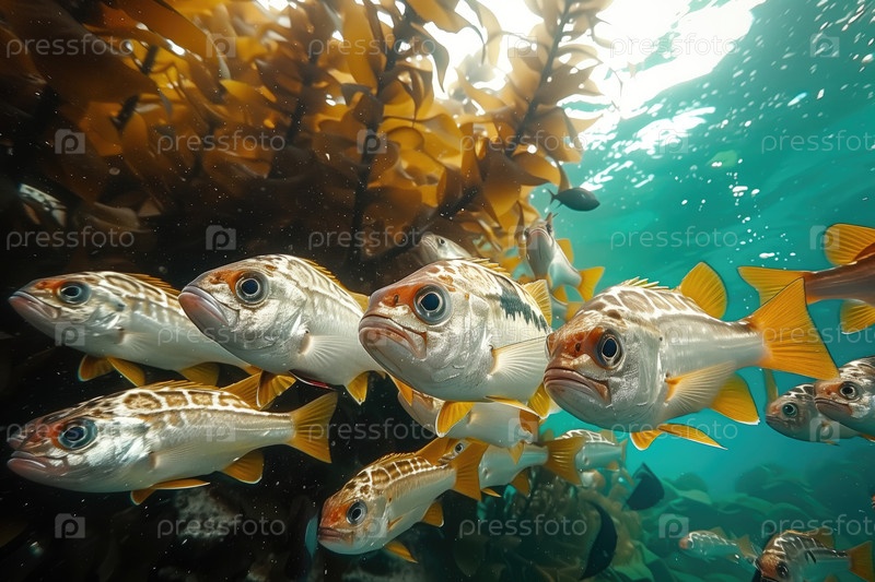 Рыба скапливается под водой среди морских водорослей