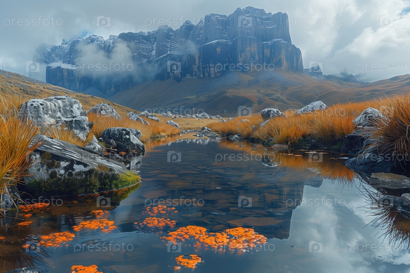 Туманный осенний пейзаж с озером и горами на заднем плане