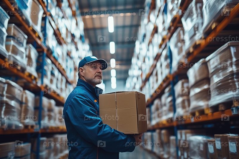 Рабочий с коробкой в руках на складе