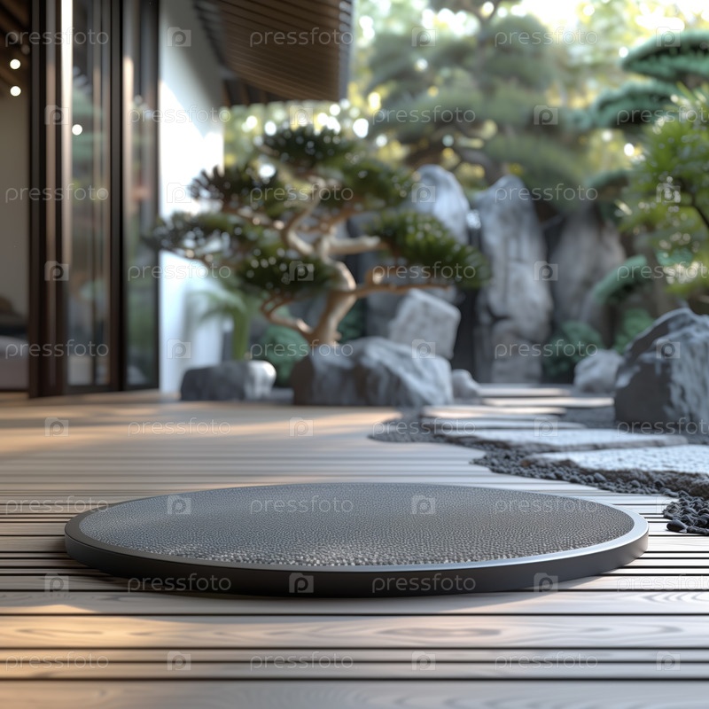Пустой каменный подиум на фоне восточного сада
