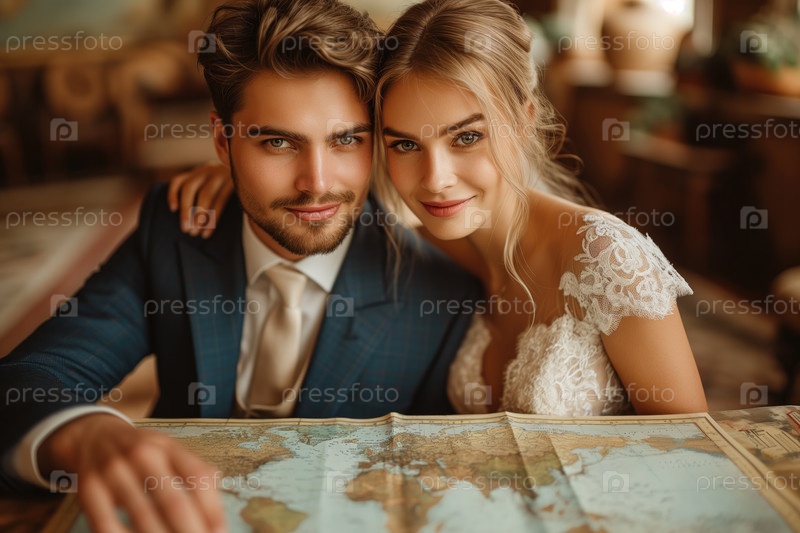 Молодожены в туристическом агентстве рассматривают карту мира и обсуждают свой медовый месяц