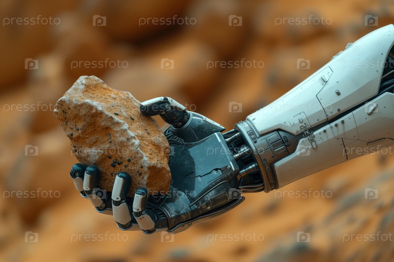 Рука гуманоидного робота держит образец минерала на размытом пустынном ландшафте