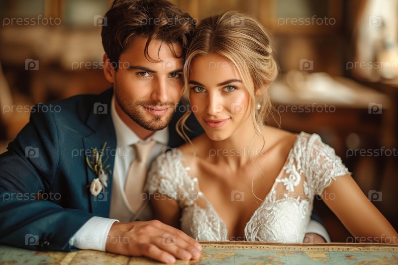 Молодожены в туристическом агентстве рассматривают карту мира и обсуждают свой медовый месяц