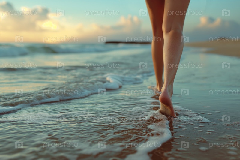 Ноги женщины, идущей по пляжу в прибое