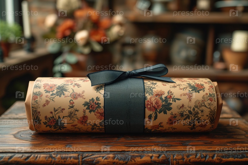 Упакованная цилиндрическая посылка с подарком, перевязанная лентой