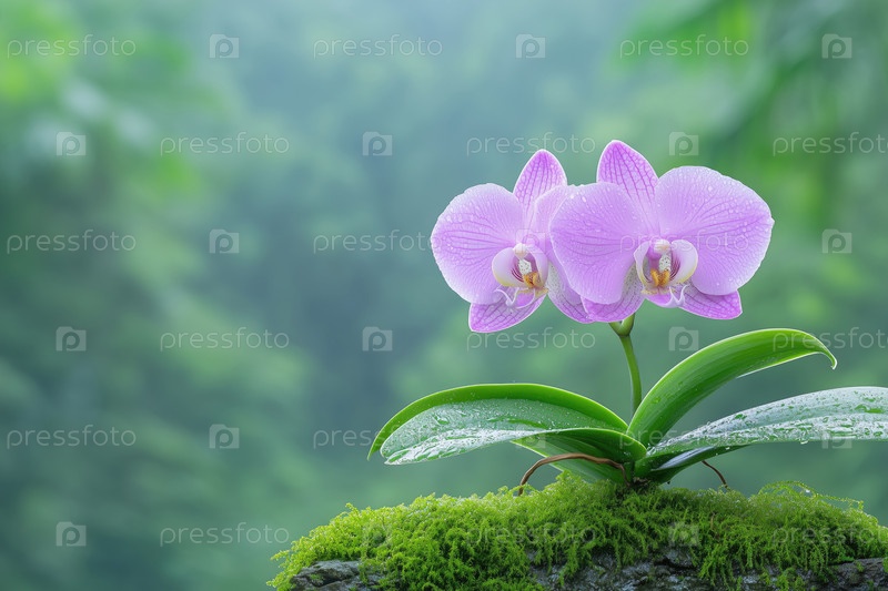 Фиолетовый цветок орхидеи на фоне зеленого мха с местом для копирования