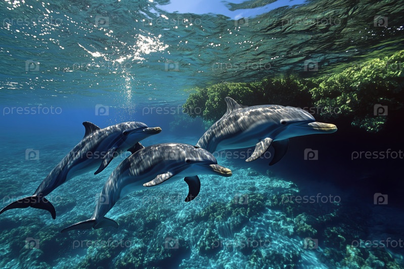 Дельфины под водой возле кораллового рифа