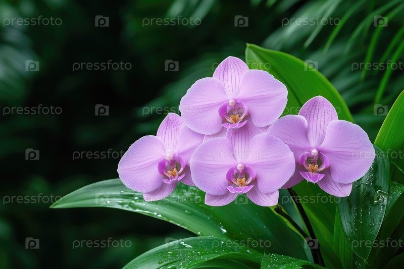 Фиолетовые цветы орхидеи с каплями воды на фоне зеленых листьев