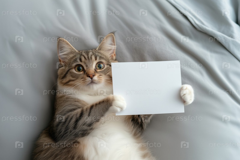 Милый кот с чистым листом бумаги на кровати