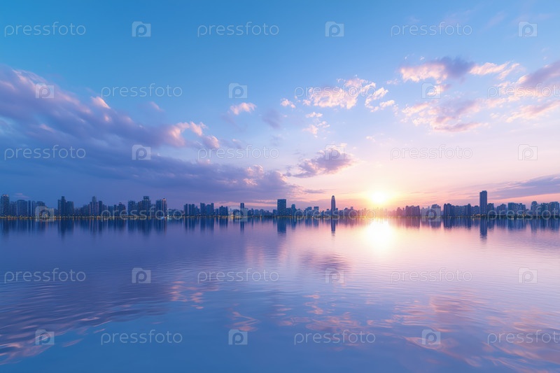 Закат в озере с отражением зданий в воде
