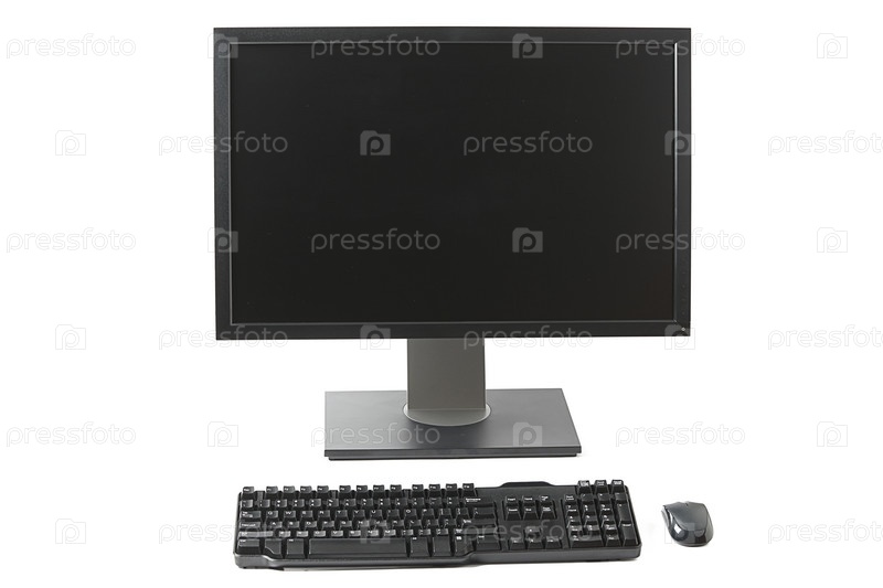 Компьютерный монитор, клавиатура, мышь на белом фоне