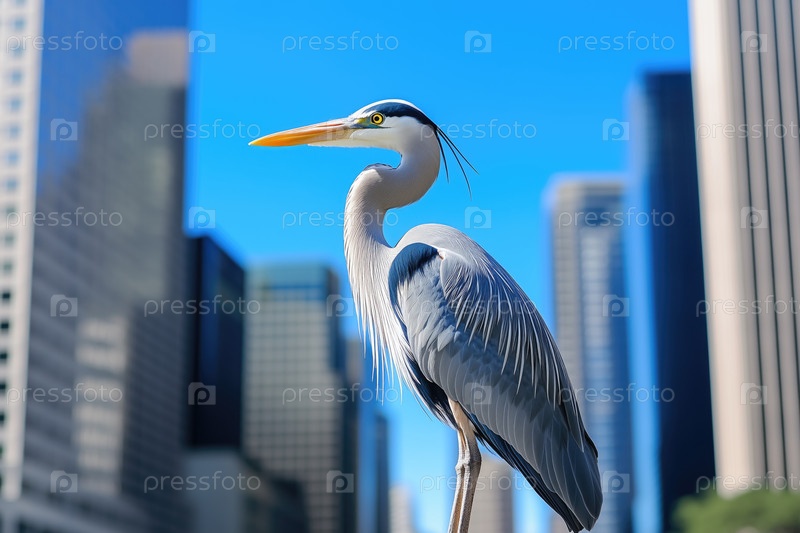 Дикая цапля стоит на фоне городских зданий