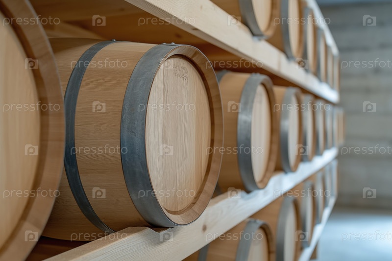 Деревянные винные бочки в погребе, крупный план. Концепция производства вина