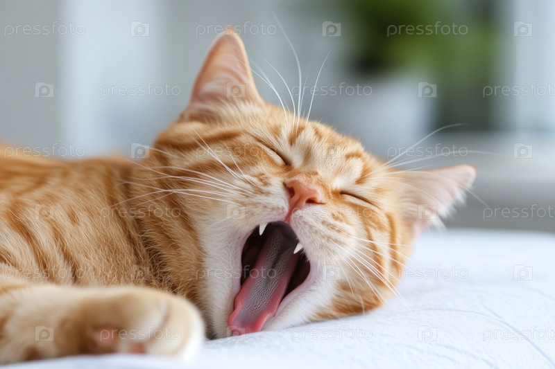 Милый рыжий кот зевает на диване дома, крупным планом