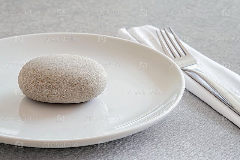 Камень на тарелке с вилкой и ножом на сером фоне