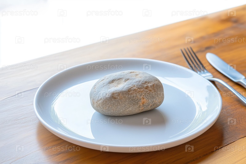 Камень на белой тарелке с ложкой и вилкой на деревянном столе