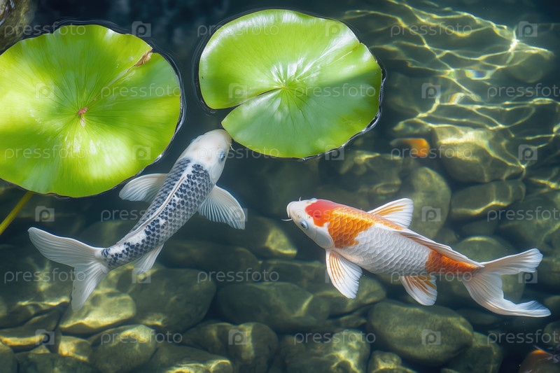 Рыбки кои плавают в пруду под зелеными листьями лотоса