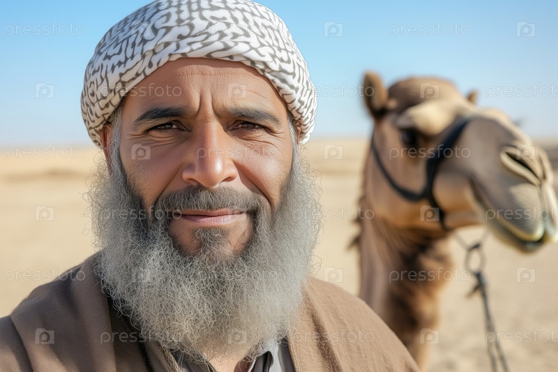 Портрет бородатого мужчины с Ближнего Востока с верблюдом в пустыне