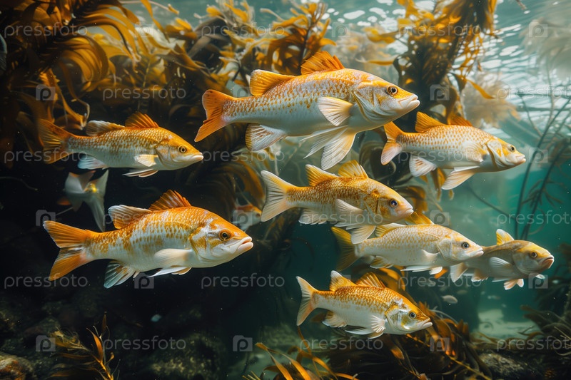 Рыбы роятся под водой среди водорослей