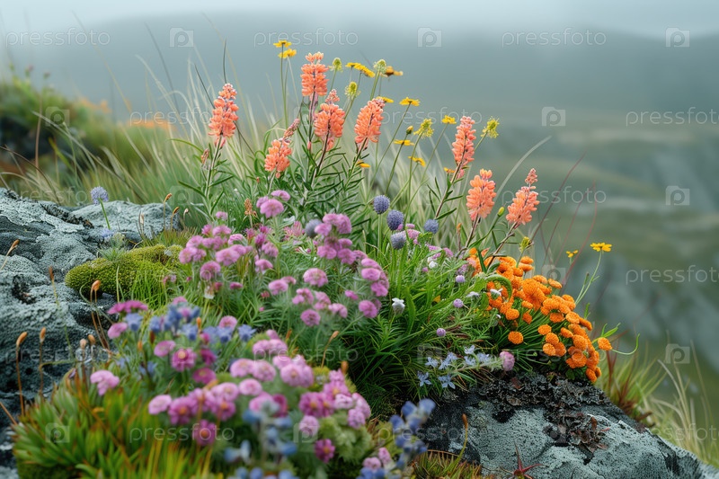 Красочные цветы в горной тундре летом в тумане
