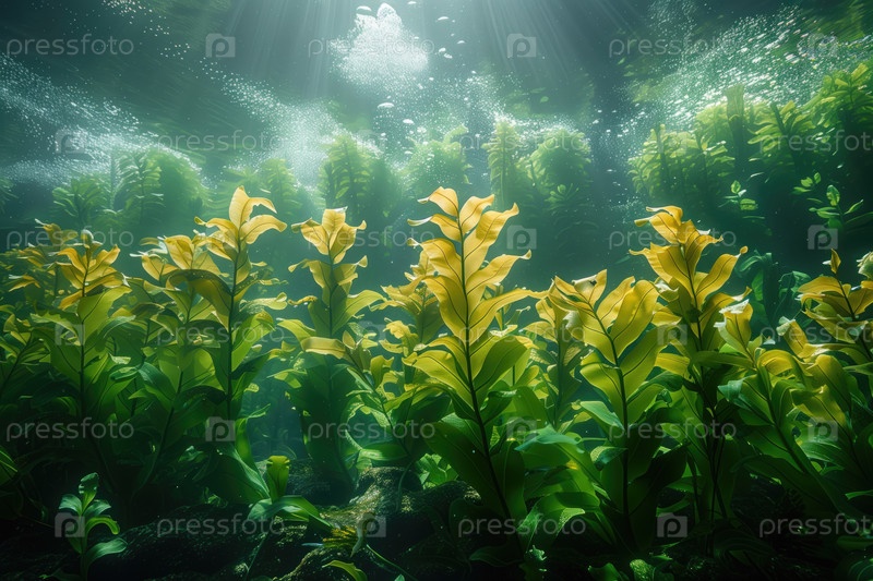 Зеленые водоросли в глубоком тропическом море. Подводная сцена с солнечным светом