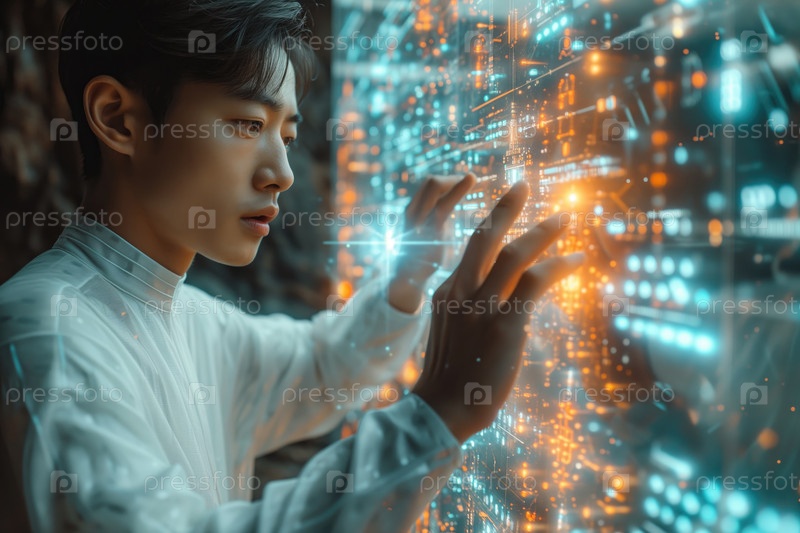Молодой азиатский мужчина работает с футуристическим интерфейсом экрана
