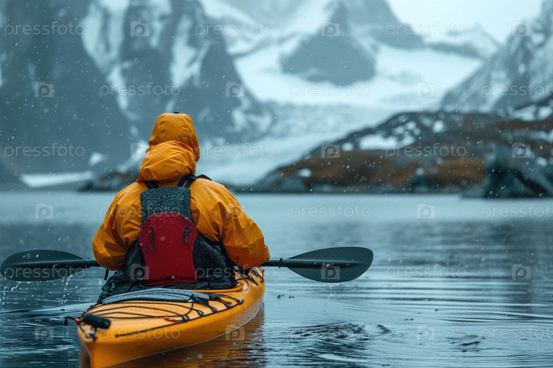 Каякер на морском каяке на фоне арктического скалистого побережья