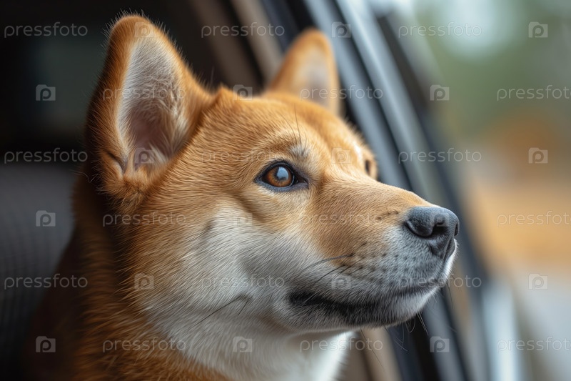 Собака породы акита-ину выглядывает из открытого окна автомобиля