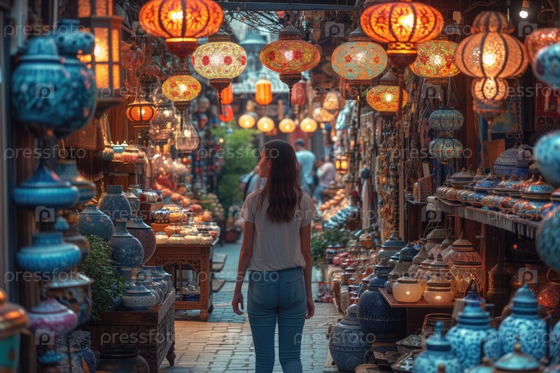Туристка на восточном базаре с магазином фонарей