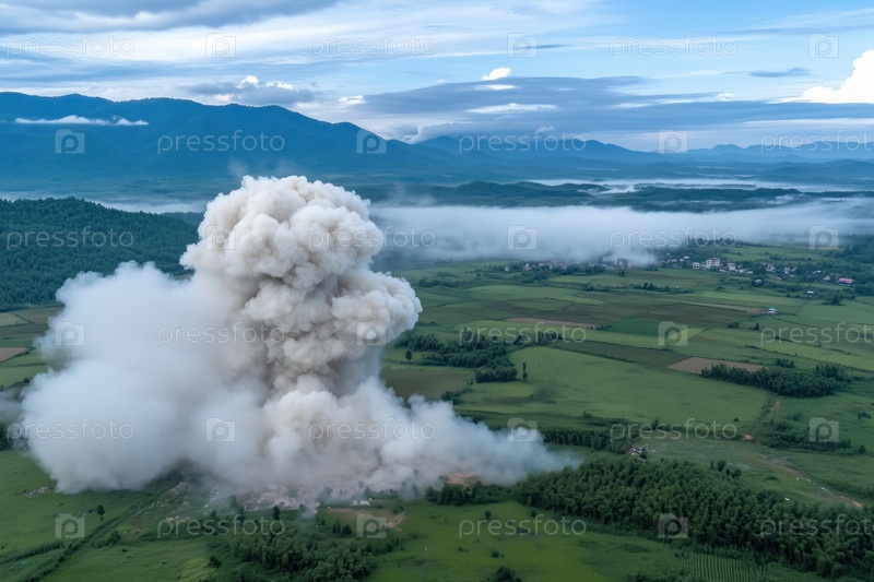 Вид с воздуха на большой взрыв в сельской местности с туманом и облаками