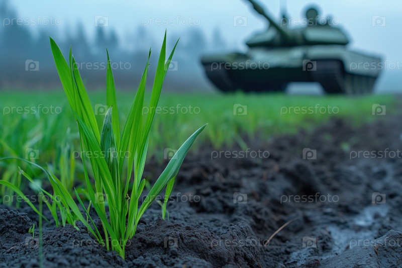 Весеннее поле и военный танк на заднем плане