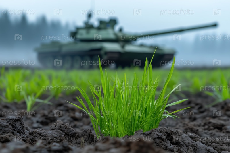 Зеленые весенние саженцы травы растут в почве на фоне военного танка