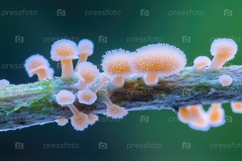 Спороношение слизевика на ветке в лесу, крупный план