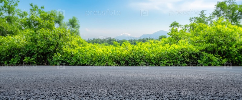 Пустая просторная асфальтированная площадка с лесом на заднем плане, подиум для автомобилей и тяжелой техники